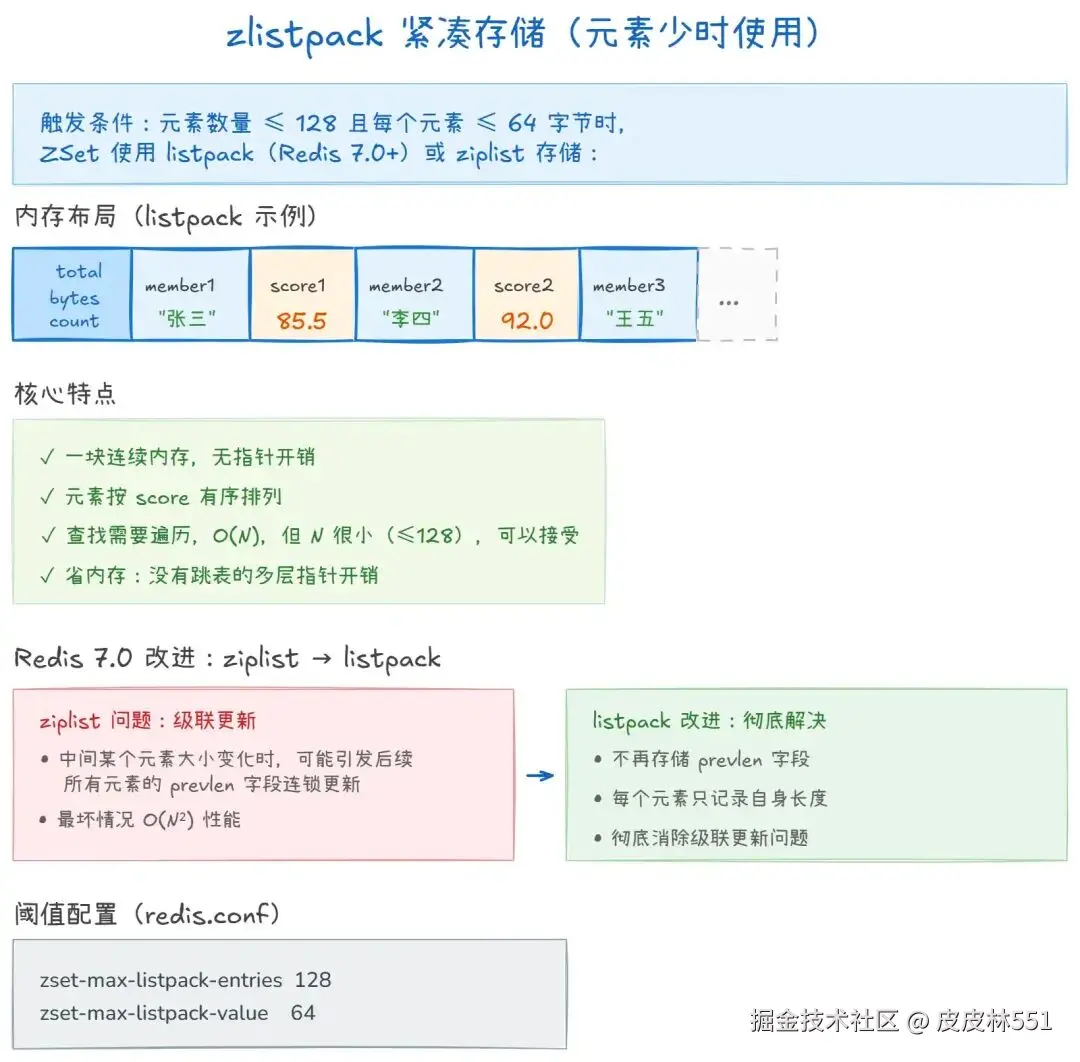 - listpack(Redis 7.0+) :一块连续内存,member 和 score 交替排列,没有指针开销。元素按 score 有序排列,查找需要遍历但 N 很小(≤128),完全可以接受。