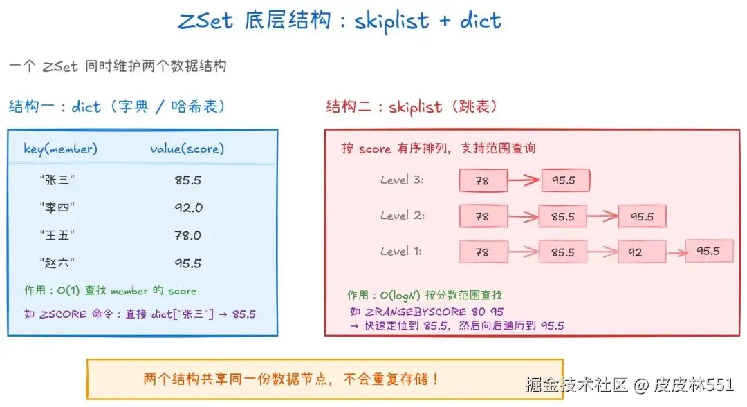 ZRANGEBYSCORE、ZRANK等命令时,跳表能快速定位。 - 两个结构共享同一份数据:字典的 value 和跳表的节点都指向同一个包含 member + score 的数据对象,不会重复存储两份,节省内存。