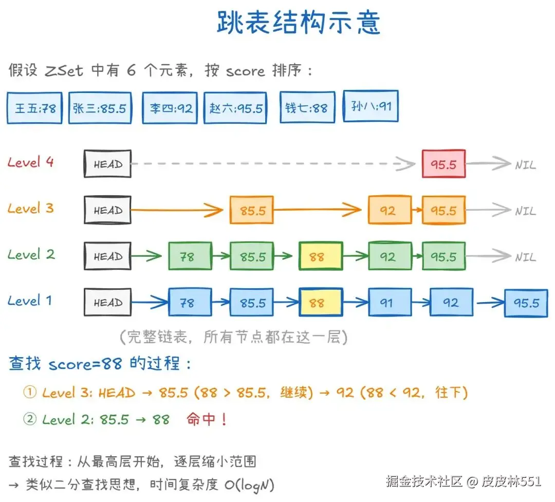 - 范围查询:先用跳表定位到起始 score(O(logN)),然后沿 Level 1 链表向后遍历 M 个元素。总时间复杂度 O(logN + M),M 为结果集大小。
