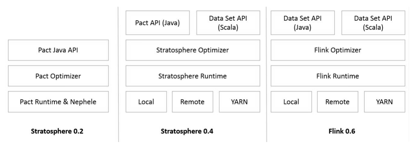 - 2014年4月16日,Stratosphere的代码被复制并捐赠给了Apache软件基金会,Flink就是在此基础上被重新设计出来的。