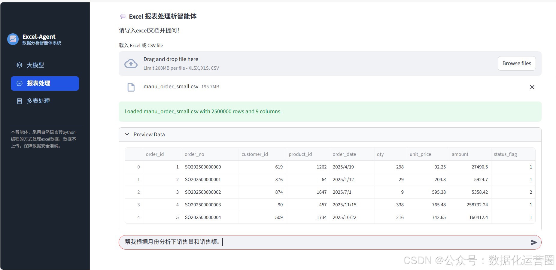 而使用这款AI数据分析工具时,工作流被大幅简化。数据加载只需直接拖拽文件或选择路径即可完成。清洗处理通过自然语言指令"去除重复订单,填充缺失手机号"一键完成。多表关联同样用一句"按客户ID关联信息表"解决。聚合计算环节指令为"按月度和区域计算复购率"。系统会自动生成对应的趋势图,无需手动选择图表类型或调整样式。整个任务从开始到产出可用结果,大约只用了十分钟。这种效率提升并非来自硬件性能的突破,而是源于交互范式的根本转变------从"告诉工具如何一步步执行"变成了"告诉工具我想要什么结果"。