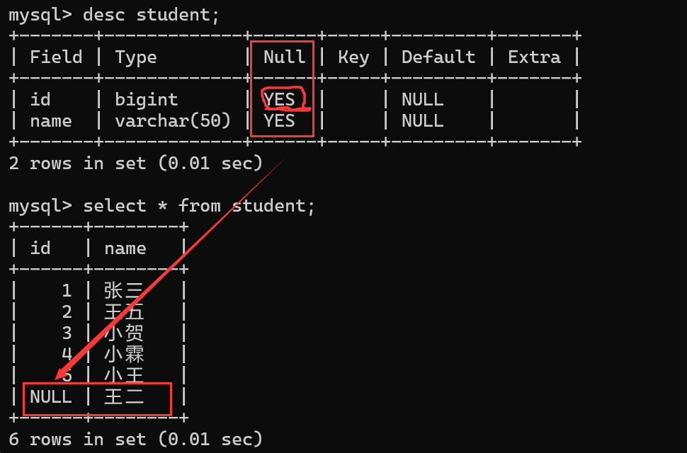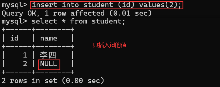 当给student表中只给插入id列插入值,name列中没有插入值,会显示name为null: