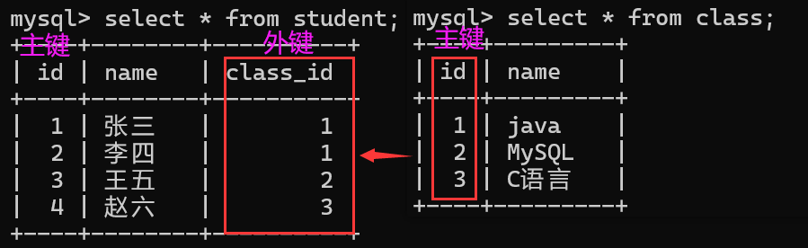 蓝色标注的class_id是学生表的外键,班级表的主键,之间通过class_id建立关联关系。
