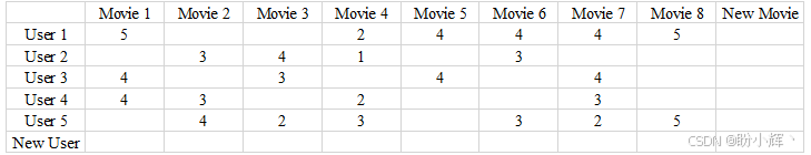 典型的推荐系统数据集结构如下图所示。在纵轴上,纵轴表示数据库中的 5 个用户,横轴对应 8 部电影。