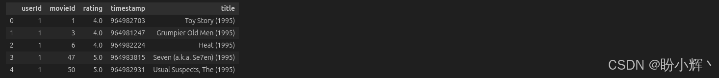 当前 DataFrame 看起来更完整,因为它同时包含了评分和电影信息。我们将使用这个 DataFrame 来构建电影推荐系统,该系统接受用户 ID (userId) 作为输入,并输出前 k 个电影片名作为推荐。