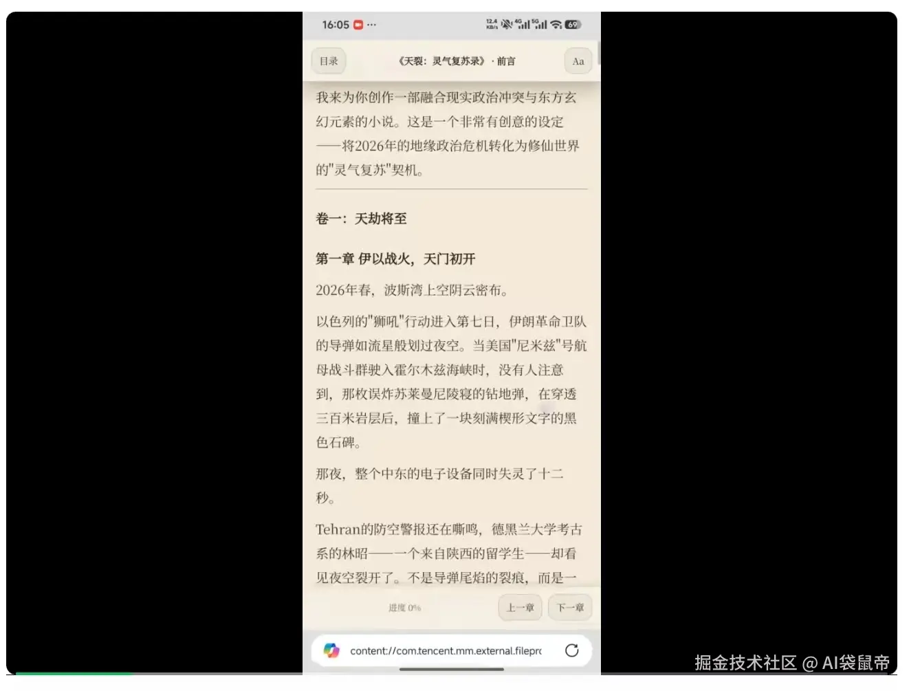 用户把生成的Markdown格式小说直接复制粘贴到这个应用里,应用就能将其转化为专业阅读器的体验(有章节目录、能翻页/滚动阅读)。同时,用户希望能把自己的AI小说分享给朋友看。