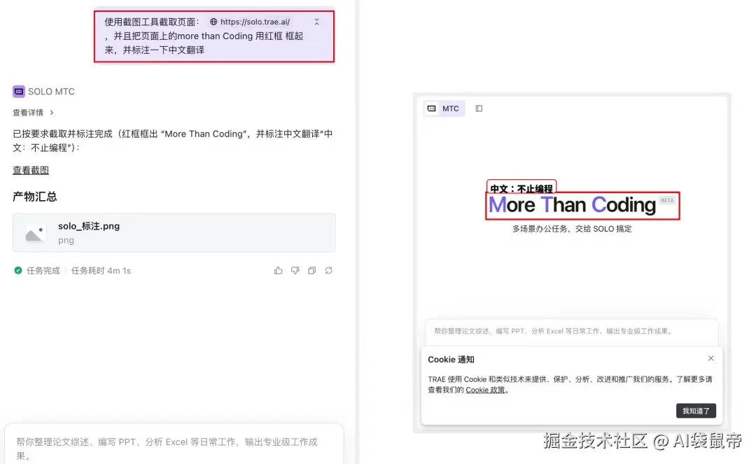 指令发出后,Solo独立端,并没有新开一个Chrome浏览器,而是在它自身的界面右侧,极其丝滑地内置打开了一个浏览器窗口。