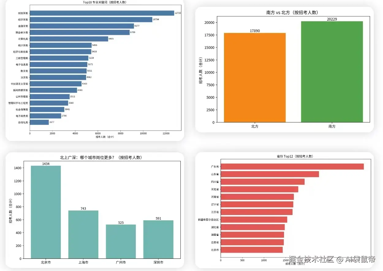 接着是按招考人数统计的前18名招收专业柱状图,数据一目了然。并分别对比了北方和南方招考人数的差异。以及专门针对北上广深四个一线城市,进行了岗位数量的专项统计。