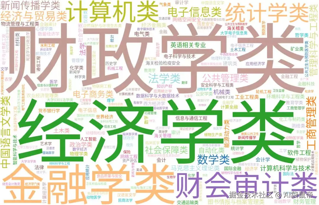 第一张是招考专业词云图。字体越大的词,代表该专业招收的岗位数量越多。一眼望去,法学、计算机、财会依然是考公的主力军。