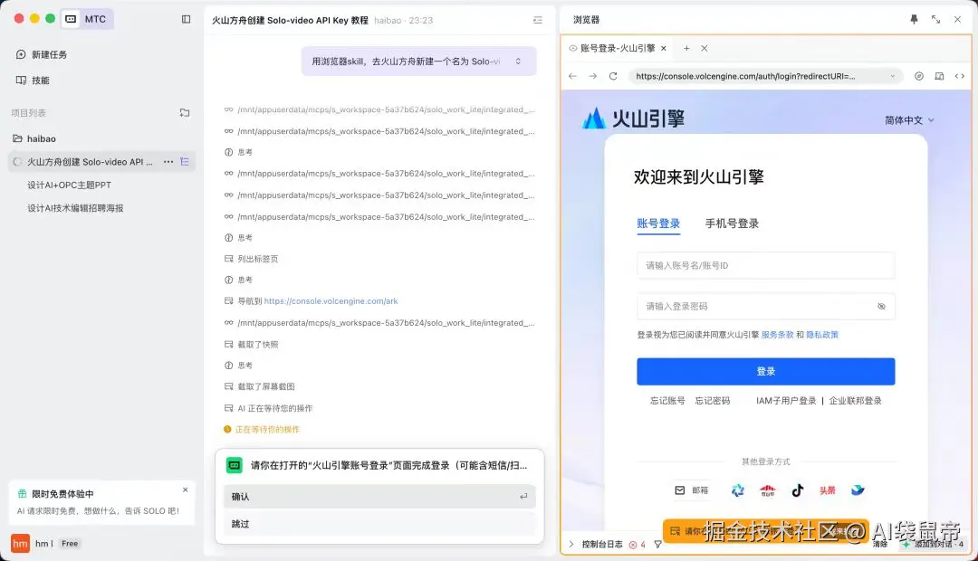 最让我佩服的是它的交互细节。 比如操作到火山引擎的登录环节时,它并没有卡死或者强行尝试,而是在聊天对话框里弹出了一个确认按钮。 提示我手动完成登录,完成后点击确认,将继续执行。