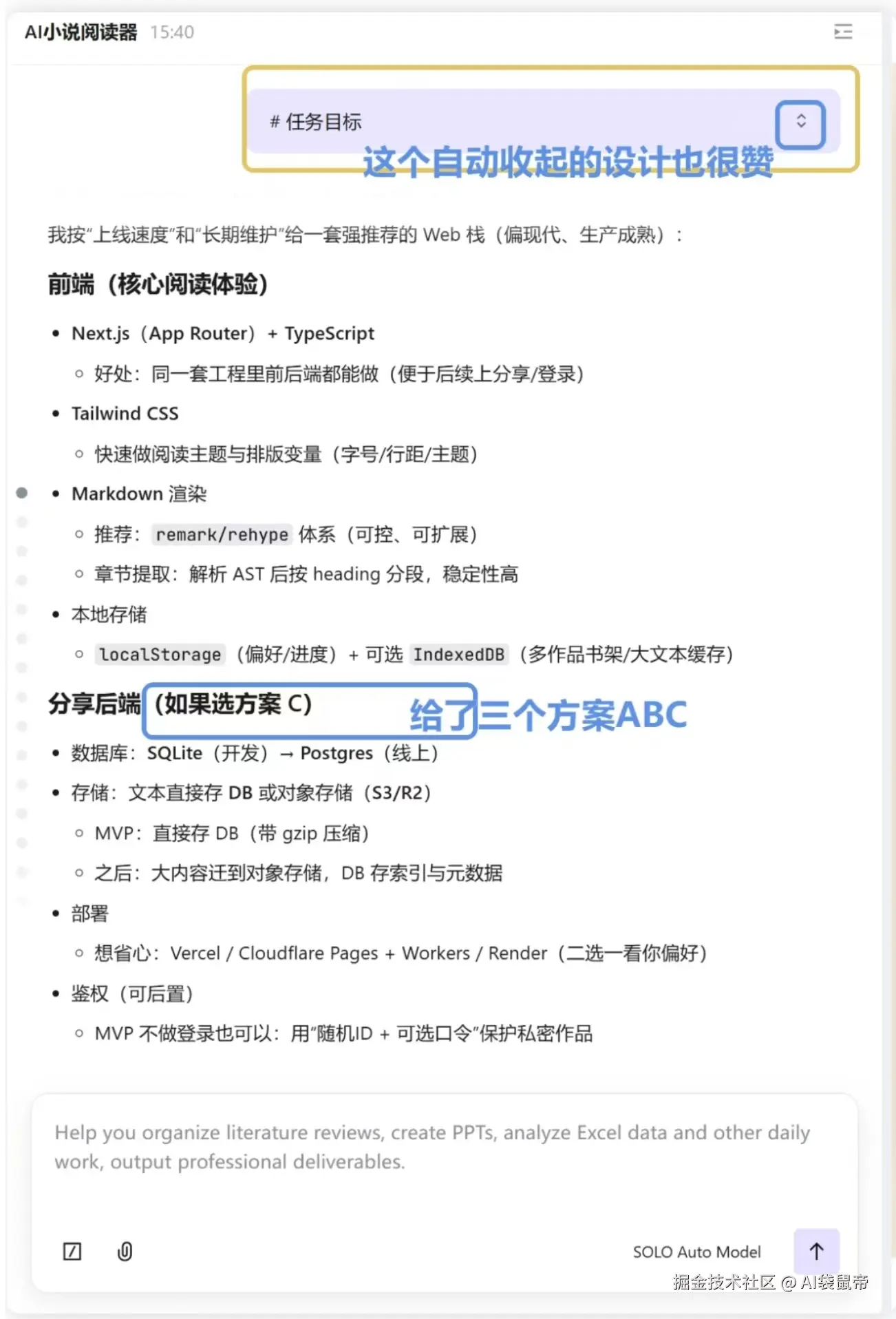我仔细拆解了一下,这里面其实有两个需求:一个是开发一个专属的阅读器,另一个是解决跨设备的分享问题。因为涉及到产品设计,我决定让Solo独立端先陪我头脑风暴一下。