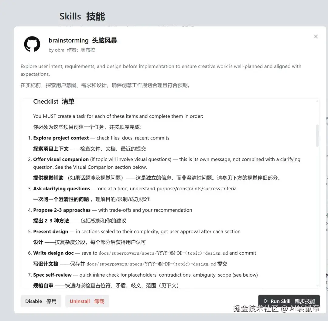 我安装了官方市场里的Brainstorming(头脑风暴)Skill