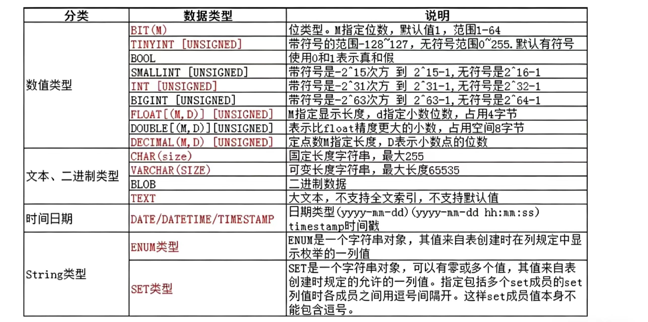 大致解读:这张表是MySQL 数据类型的分类速查表 ,按存储类别划分,核心作用是快速查阅各类数据的定义规则、存储特性与适用场景,整体分为 4 大类别: