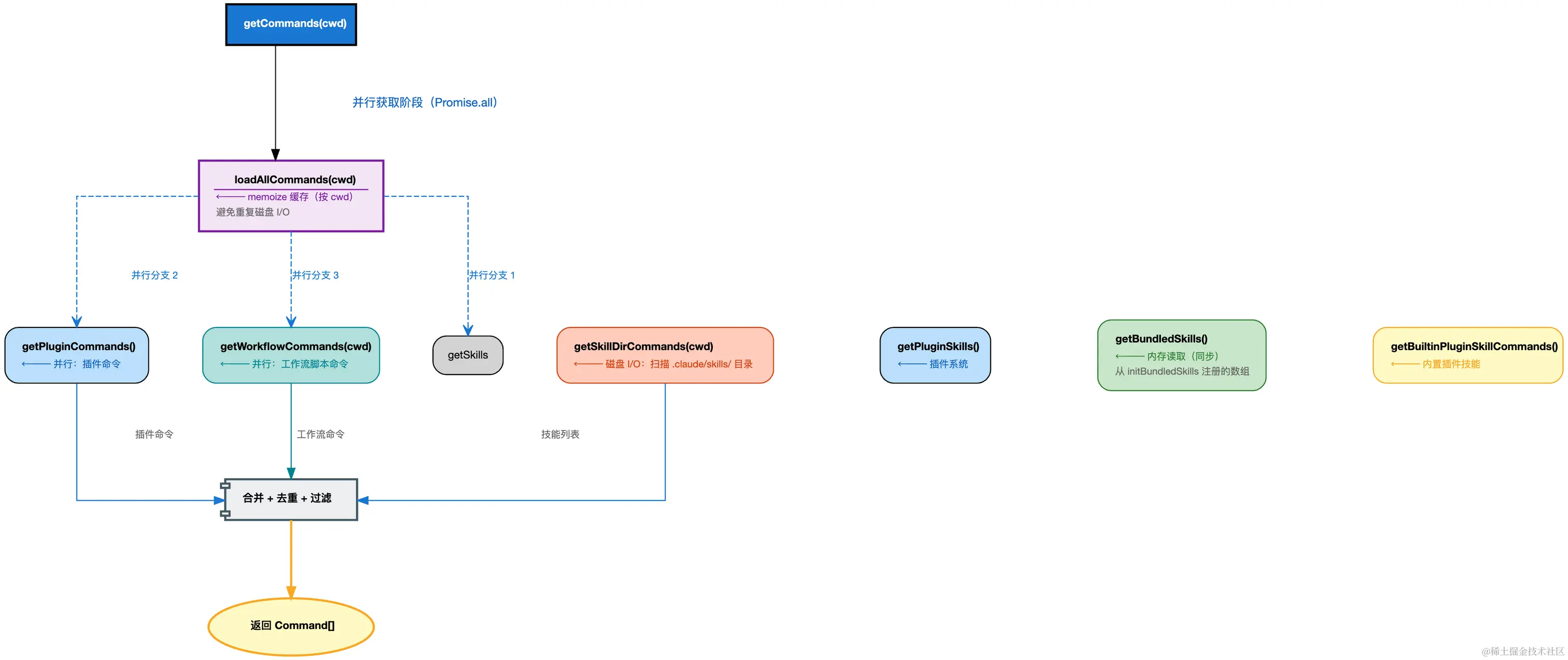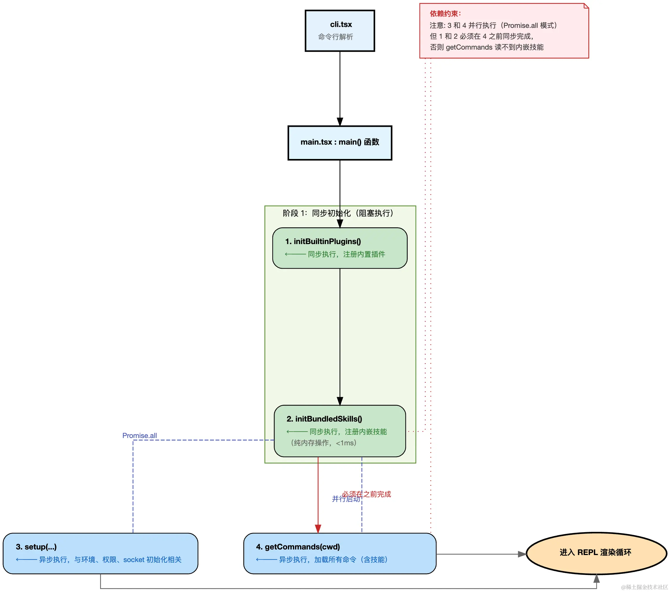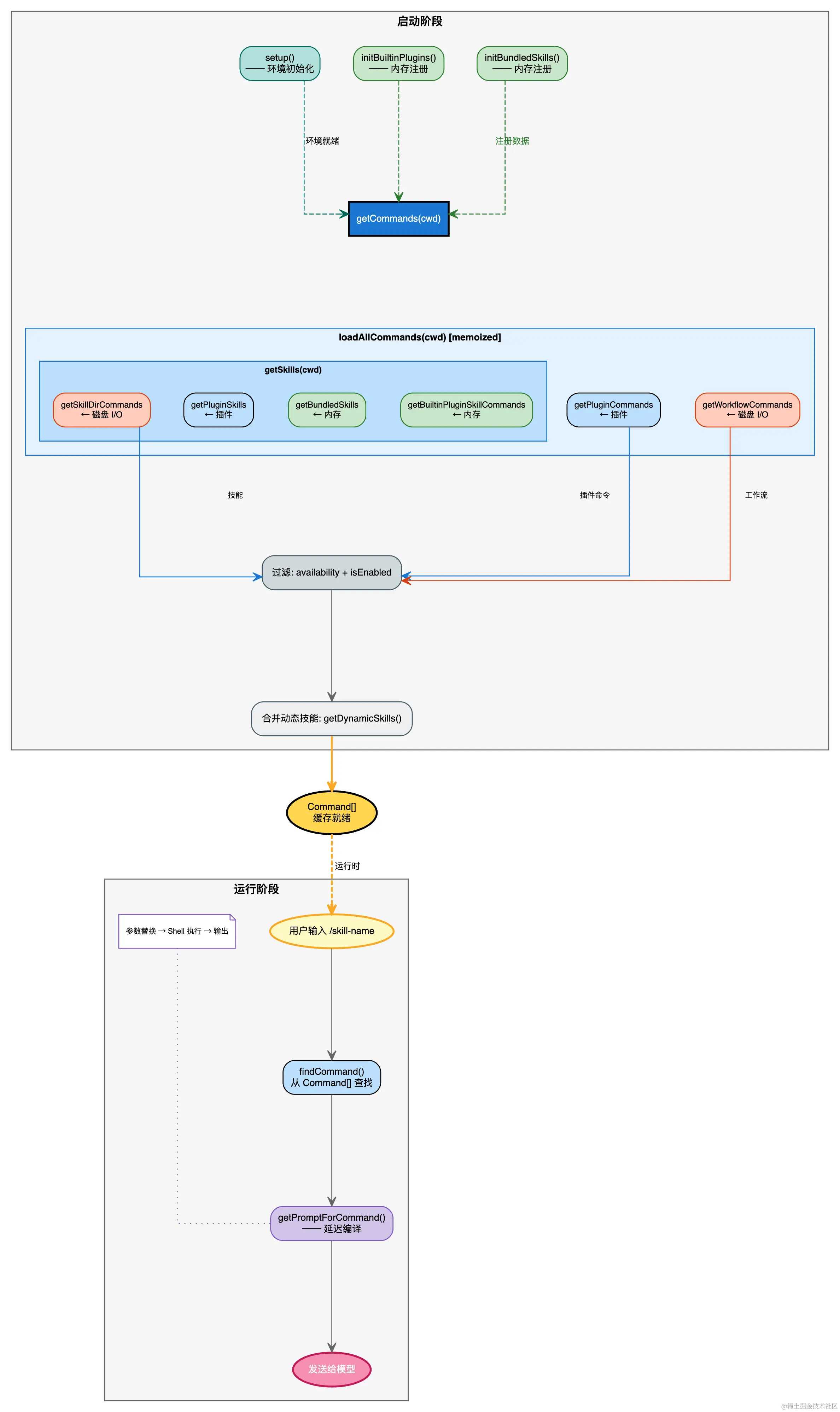 为什么要这样设计 :initBundledSkills() 是纯内存的数组 push 操作(bundledSkills.push(skill)),耗时 <1ms。它必须在 getCommands() 启动前完成,否则 getBundledSkills() 返回空数组,结果技能会丢失。