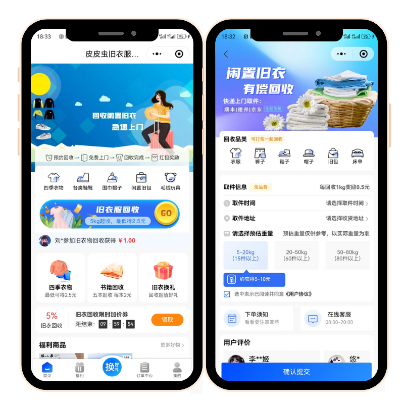 打开小程序,首页以温和的色调呈现着回收服务的核心入口。用户可以快速发起回收预约,也可以先浏览回收流程介绍,了解哪些类型的衣物可以回收、如何处理以及最终的去向。页面上方展示着近期的环保成果数据,用直观的方式呈现参与回收所减少的碳排放或节约的水资源,让每一次行动都看得见意义。