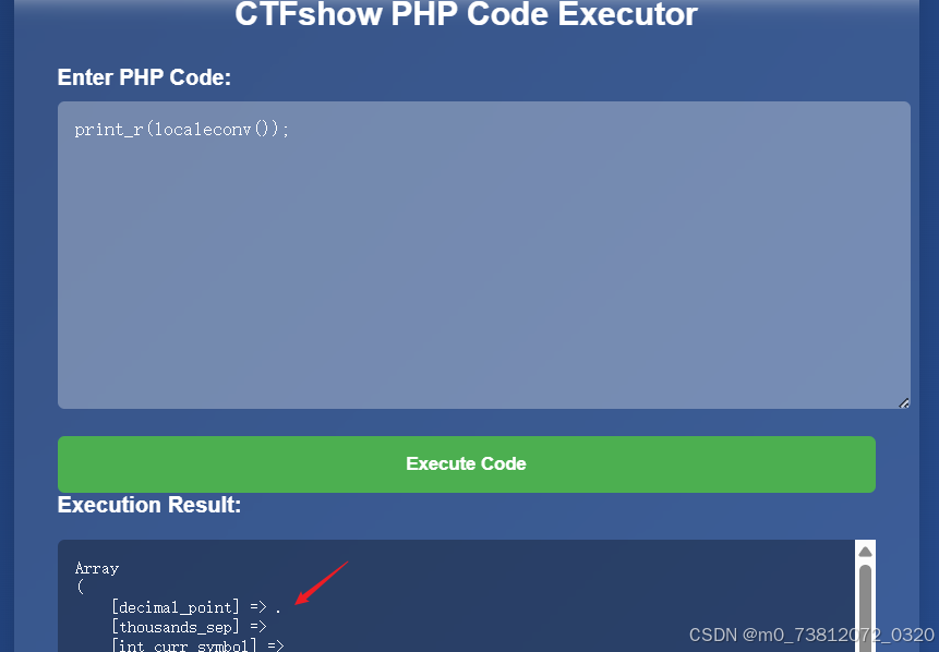 (1)print_r(localeconv()); 得到小数点. 所以接下来可以使用 scandir('.') 打印出当前目录: