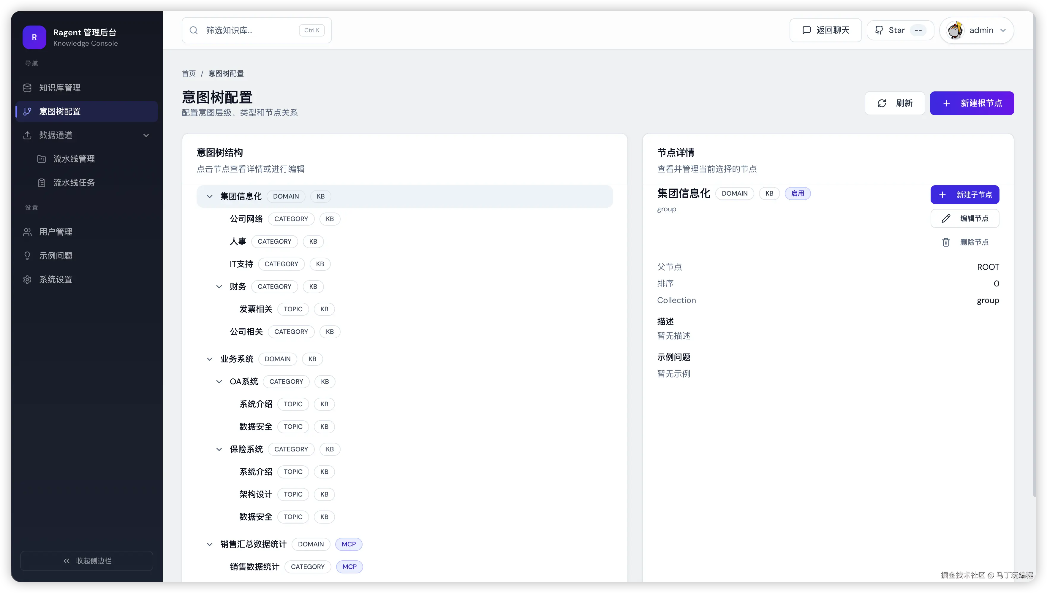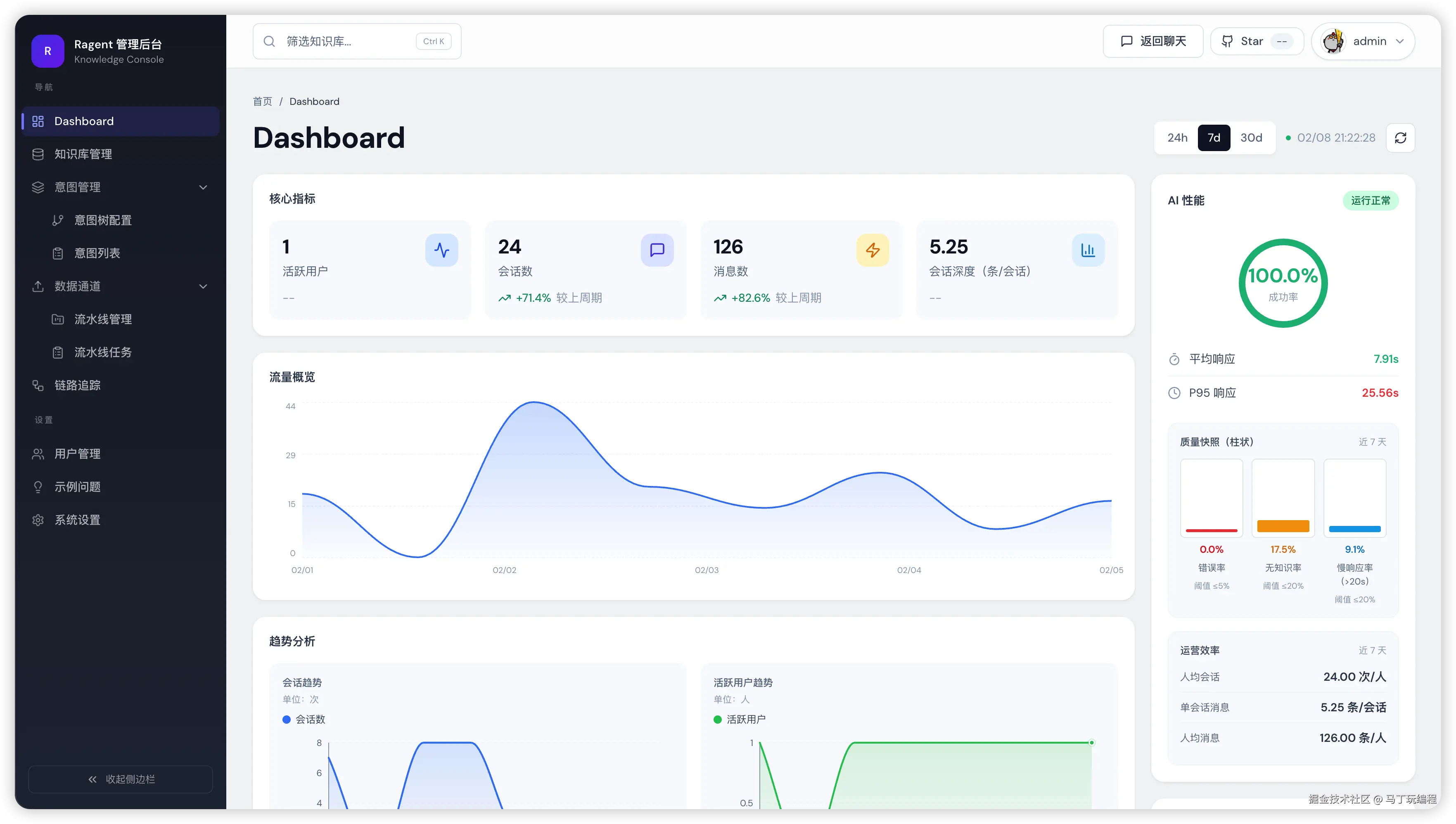 - 管理后台:完整的 React 管理界面,涵盖知识库管理、意图树编辑、入库任务监控、链路追踪查看、系统设置等功能。