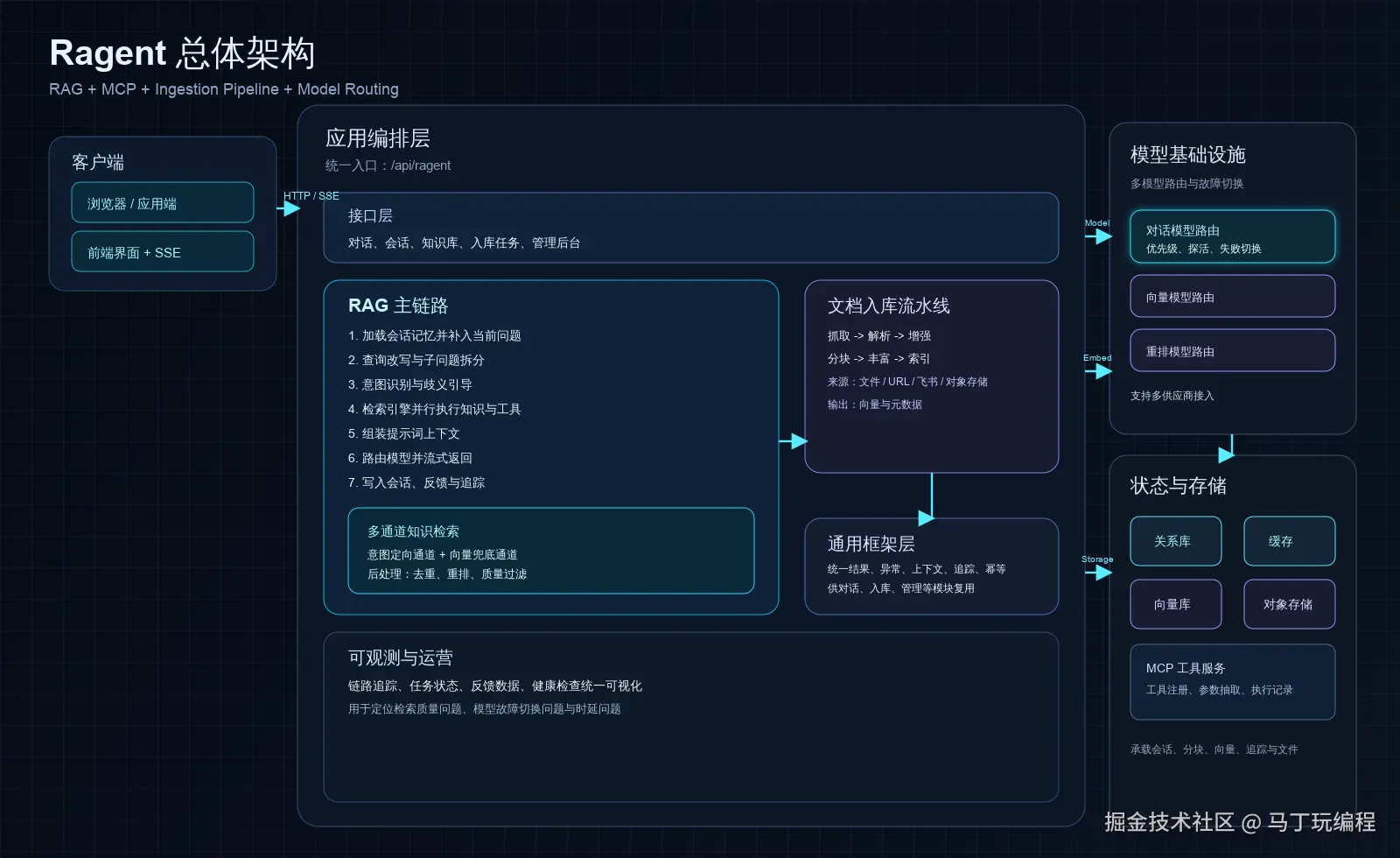 它不是一个跑通 Demo 就收工的玩具项目,而是覆盖了 RAG 系统从文档入库到智能问答全链路的完整工程实现。你在企业里做 RAG 会遇到的问题------文档解析、分块策略、多路检索、意图识别、问题重写、会话记忆、模型容错、MCP 工具调用、链路追踪------Ragent 里都有对应的解决方案。
