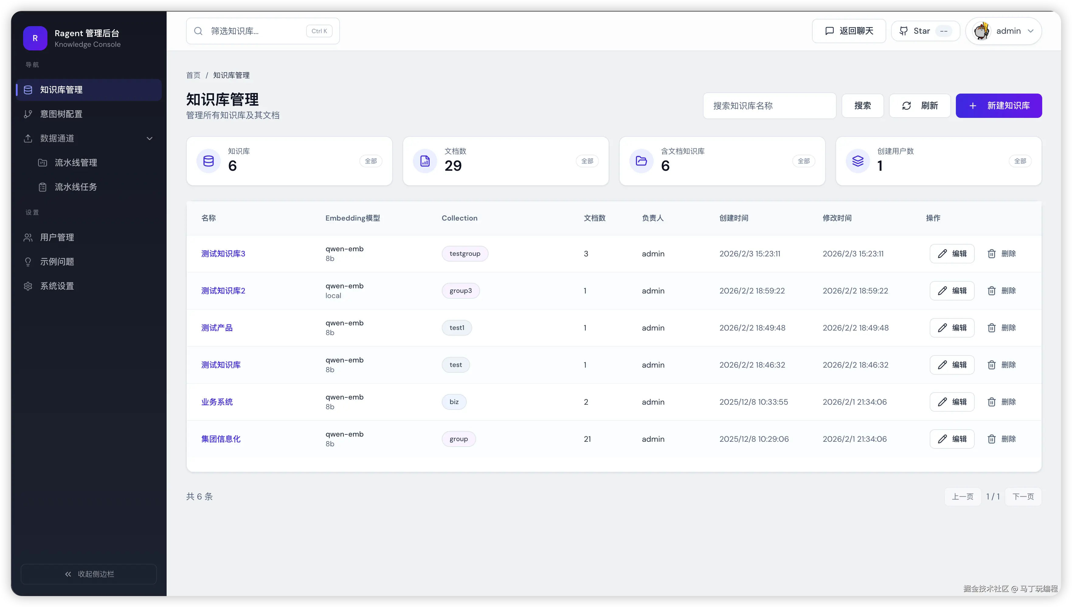 Ragent 提供完整的可视化控制台,覆盖普通用户与管理员用户两类使用场景,界面简洁直观,操作高效便捷。