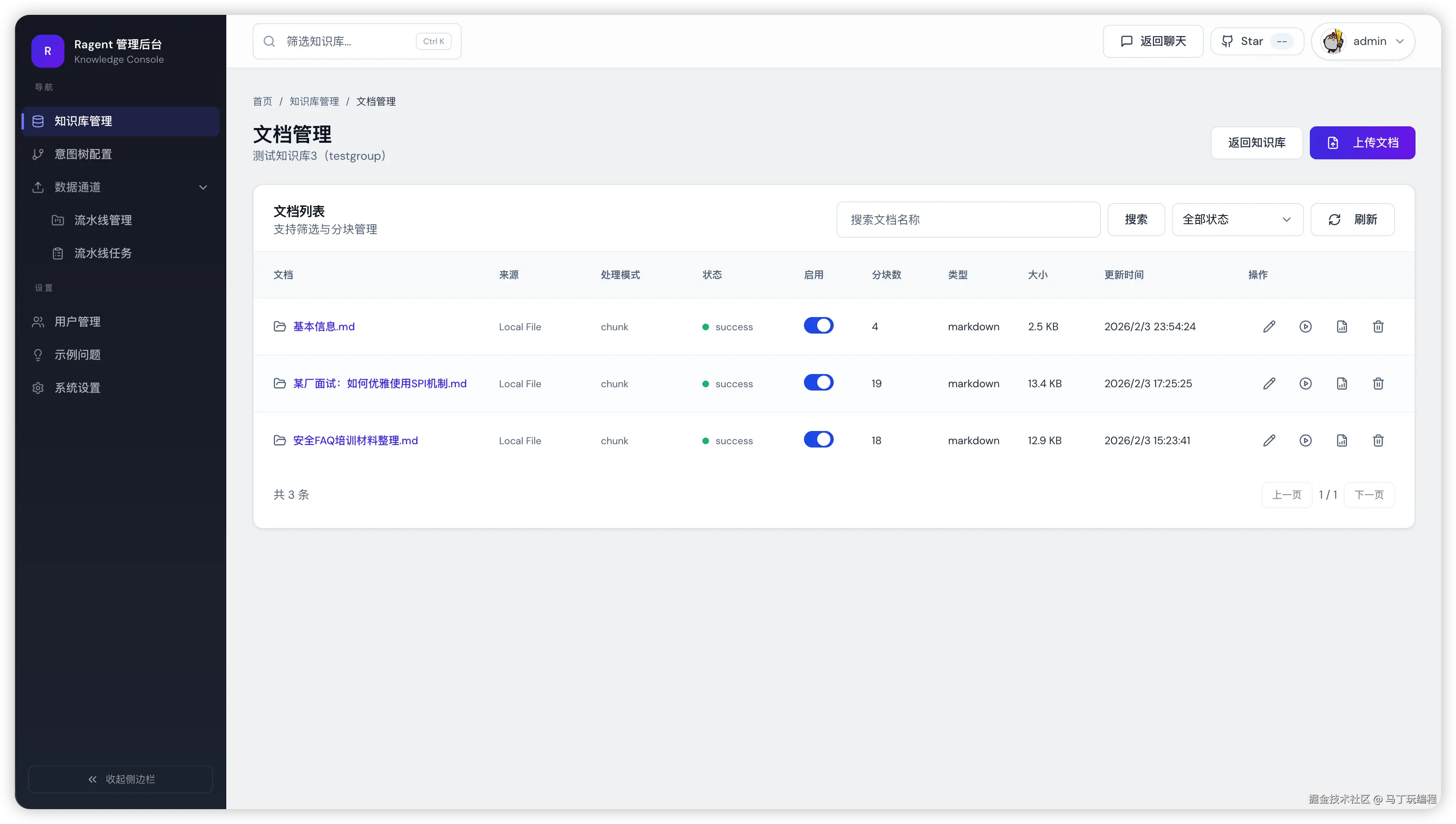 一句话总结:Ragent 是一个你可以直接拿来学习企业级 RAG 系统是怎么设计和落地的项目。