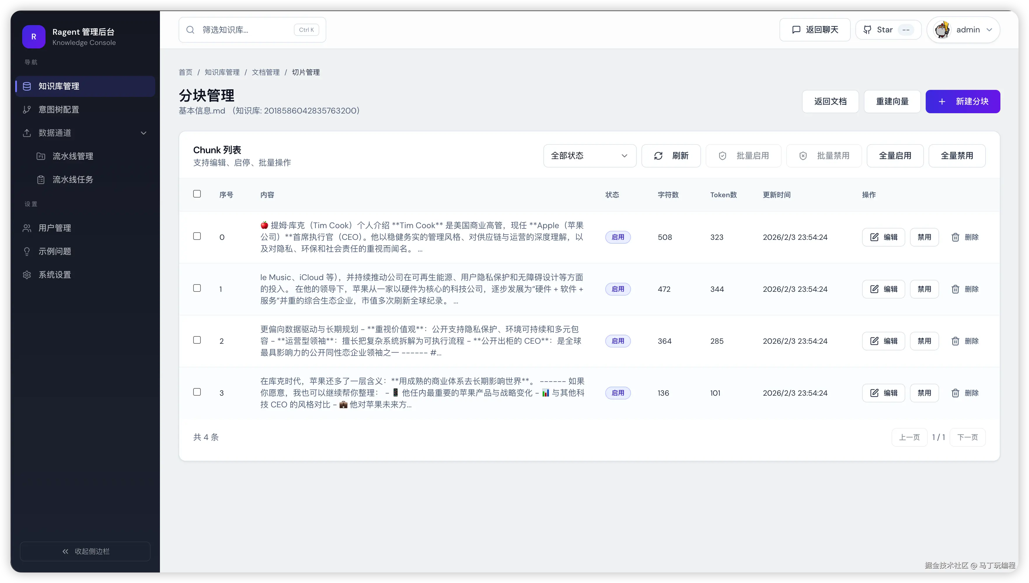 为了避免传统系统常见的"毛坯界面"体验,Ragent 的控制台经过多轮 AI 辅助设计与优化,逐步迭代完善,最终呈现出当前简洁、美观且实用的界面效果。