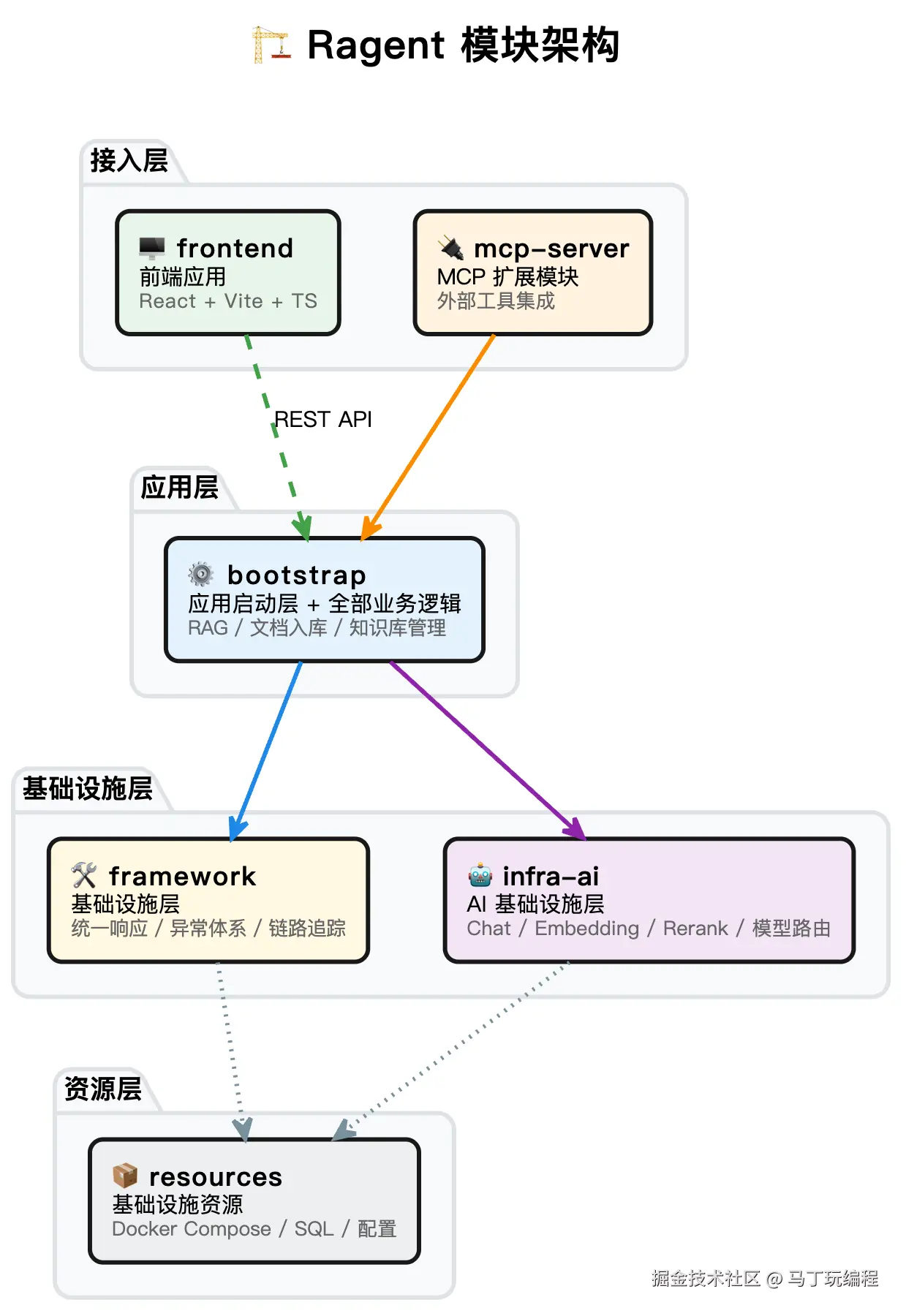 Ragent 采用前后端分离的单体架构,后端按职责分为四个 Maven 模块: