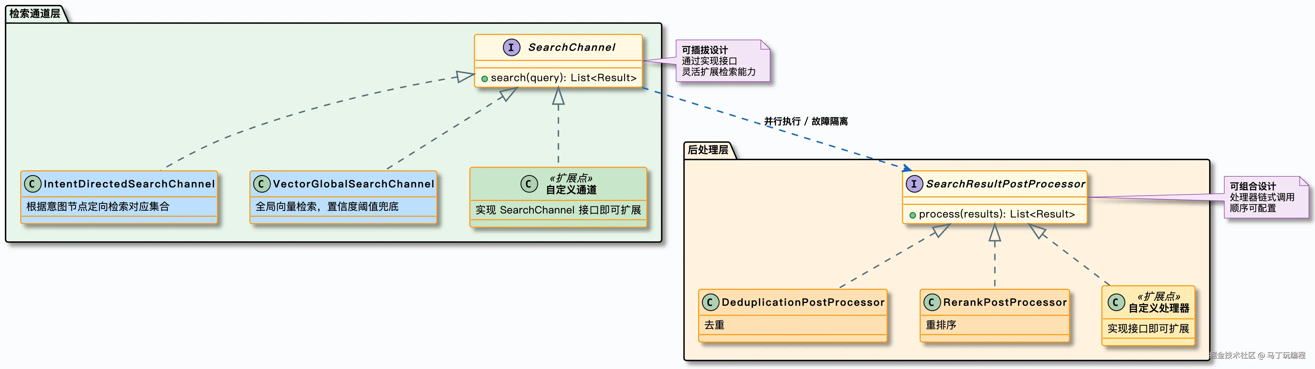 | 策略模式 | SearchChannel、PostProcessor、MCPToolExecutor | 检索通道、后处理器、MCP 工具可插拔替换 |