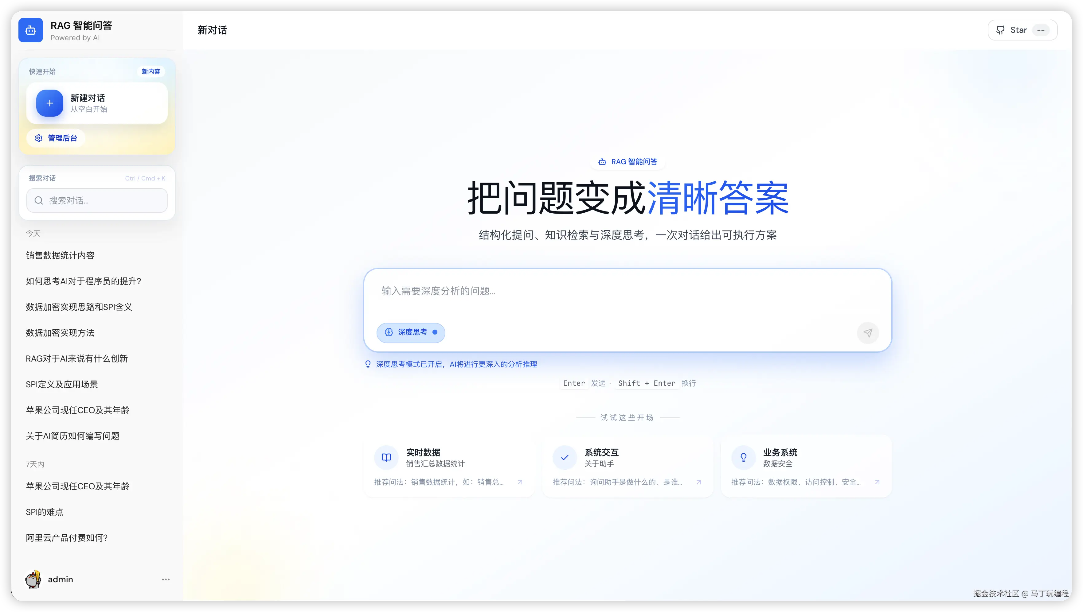用户访问 Ragent 首页后,可在输入框中直接输入问题发起问答,同时支持开启深度思考模式以获得更高质量的回答。