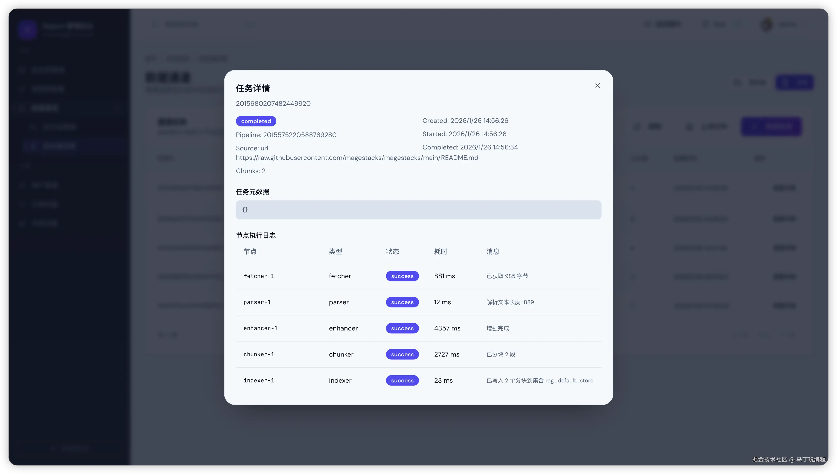 每个节点的配置存储在数据库中,支持条件执行和输出链式传递。每个任务和节点都有独立的执行日志,出了问题能精确定位到哪一步。