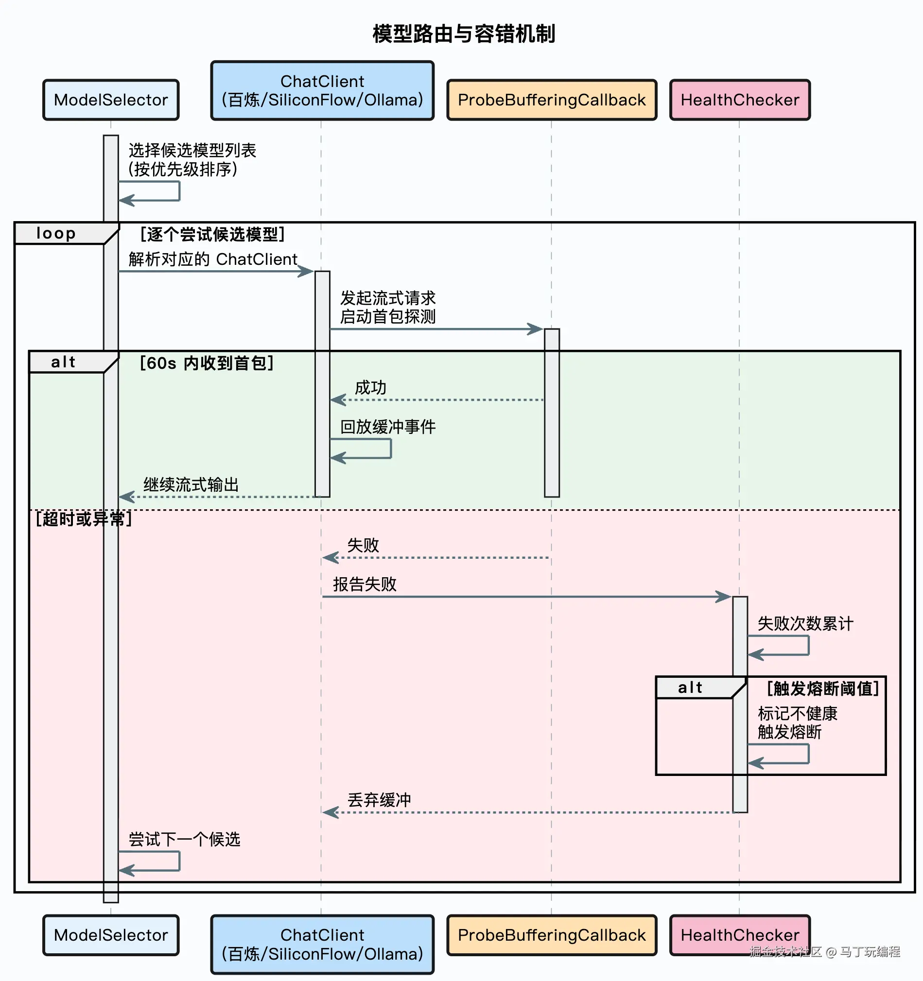 - 熔断:模型健康检查 + 失败计数,自动熔断不可用的模型,避免反复超时。
