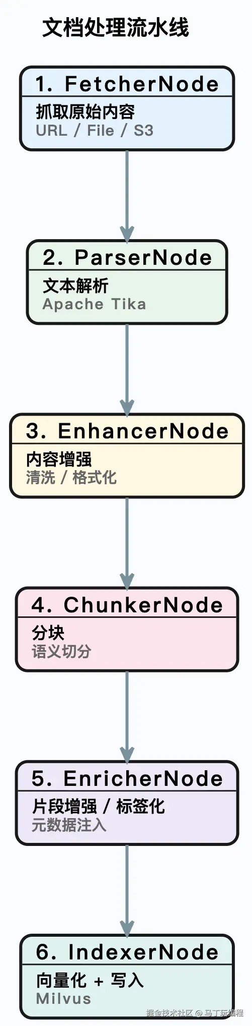 - 文档入库流水线:基于节点编排的 Pipeline 架构,从文档抓取、解析、增强、分块、向量化到写入 Milvus,每一步可配置、可扩展、有日志。