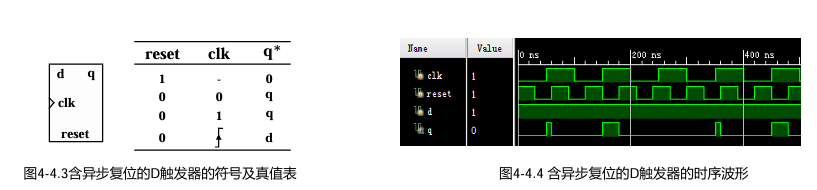 注:使用异步复位信号违反了同步设计方法,因此应该在正常操作中避免。其主要应用于执行系统 初始化。例如,在打开系统电源之后,我们可以生成一个短的复位脉冲迫使系统进入初始状态。