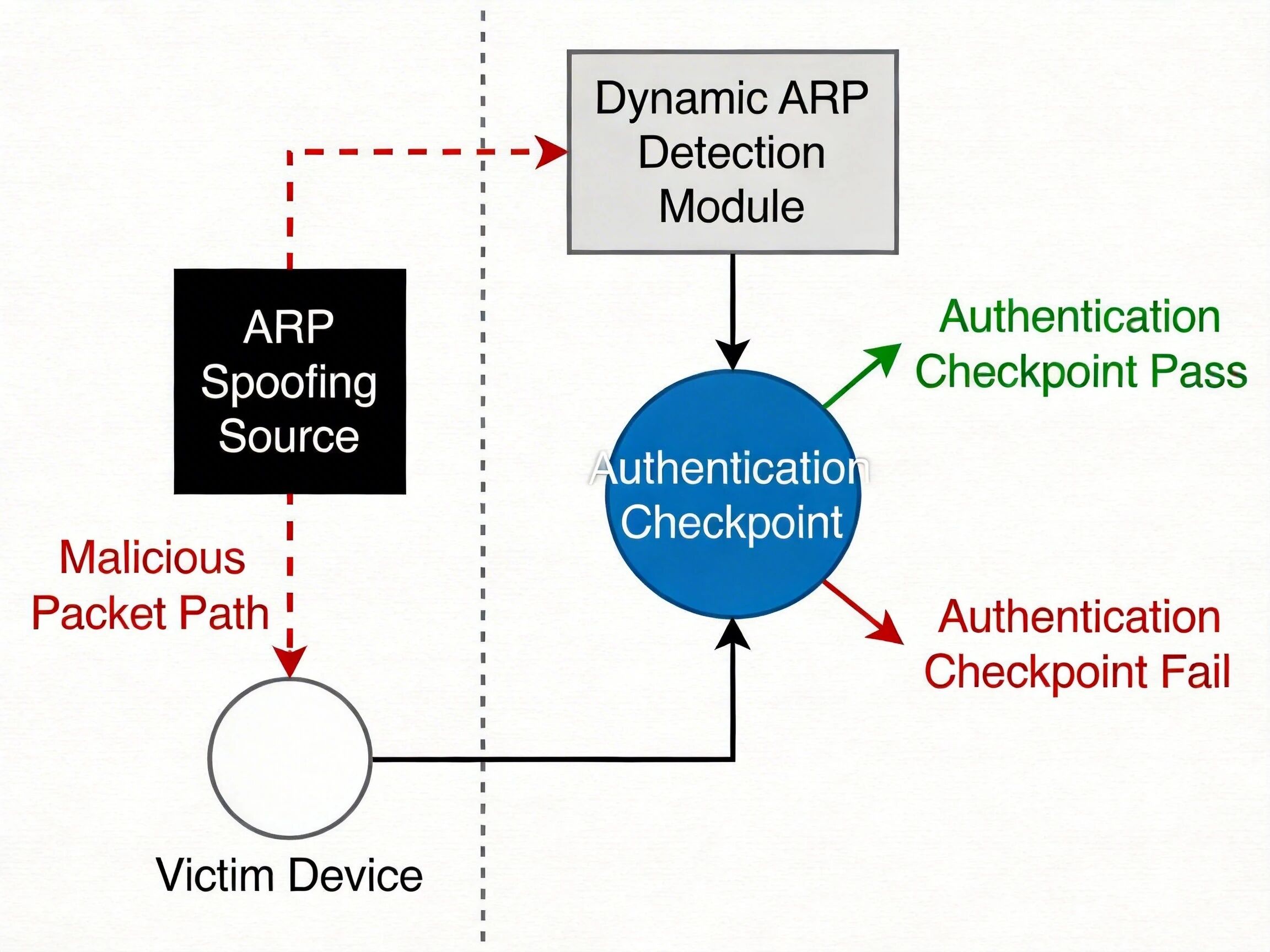 ARP 攻击与防御机制示意图,包含 ARP 欺骗的流量劫持流程、动态 ARP 检测的校验逻辑图