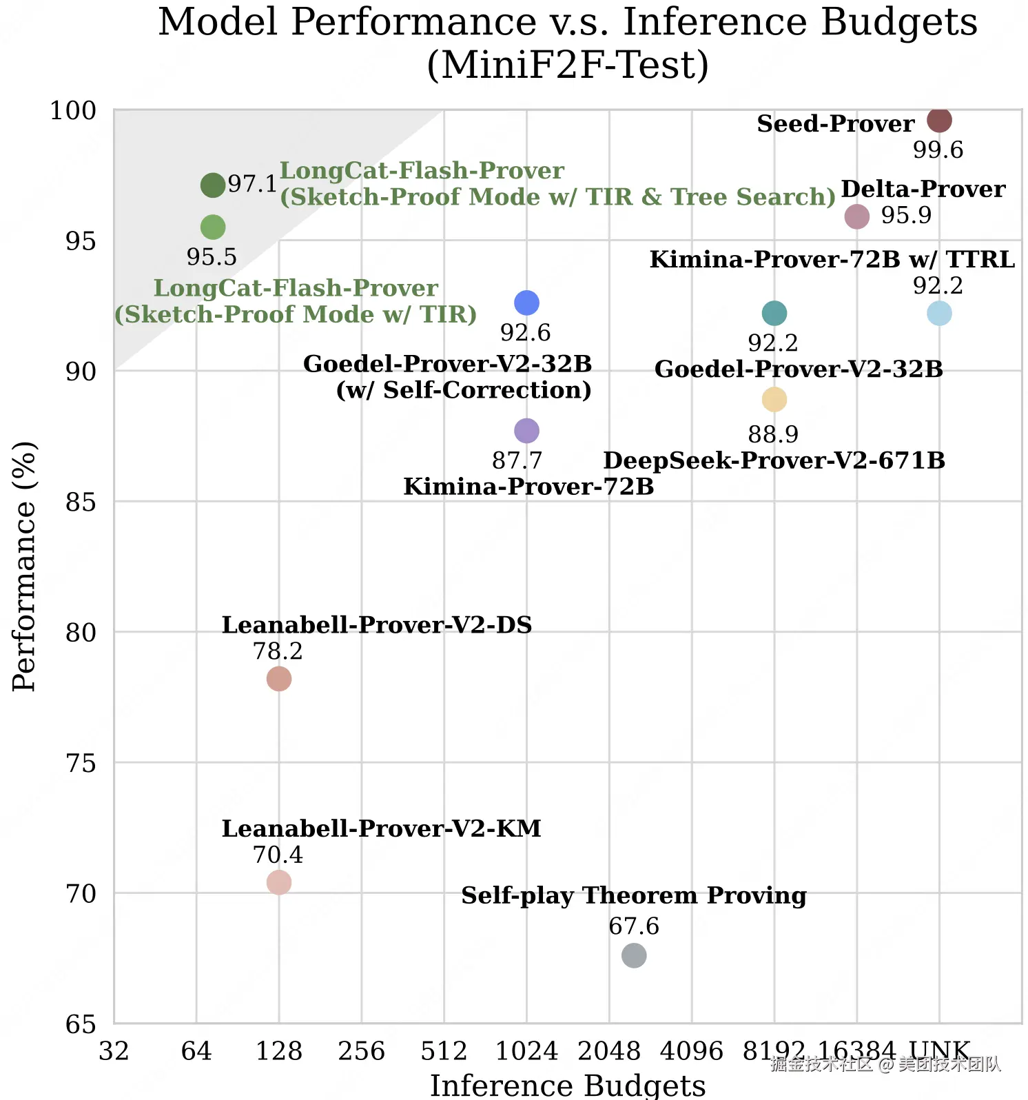 - 极高的样本效率(低预算、高通过率) :过去,模型往往需要尝试上千次才能碰巧证明一个难题。而 LongCat-Flash-Prover 在结合工具集成推理(TIR)后,仅需 72 次尝试,就在 MiniF2F-Test 数据集上达到了 97.1% 的通过率,刷新了已知开源模型的 SOTA。