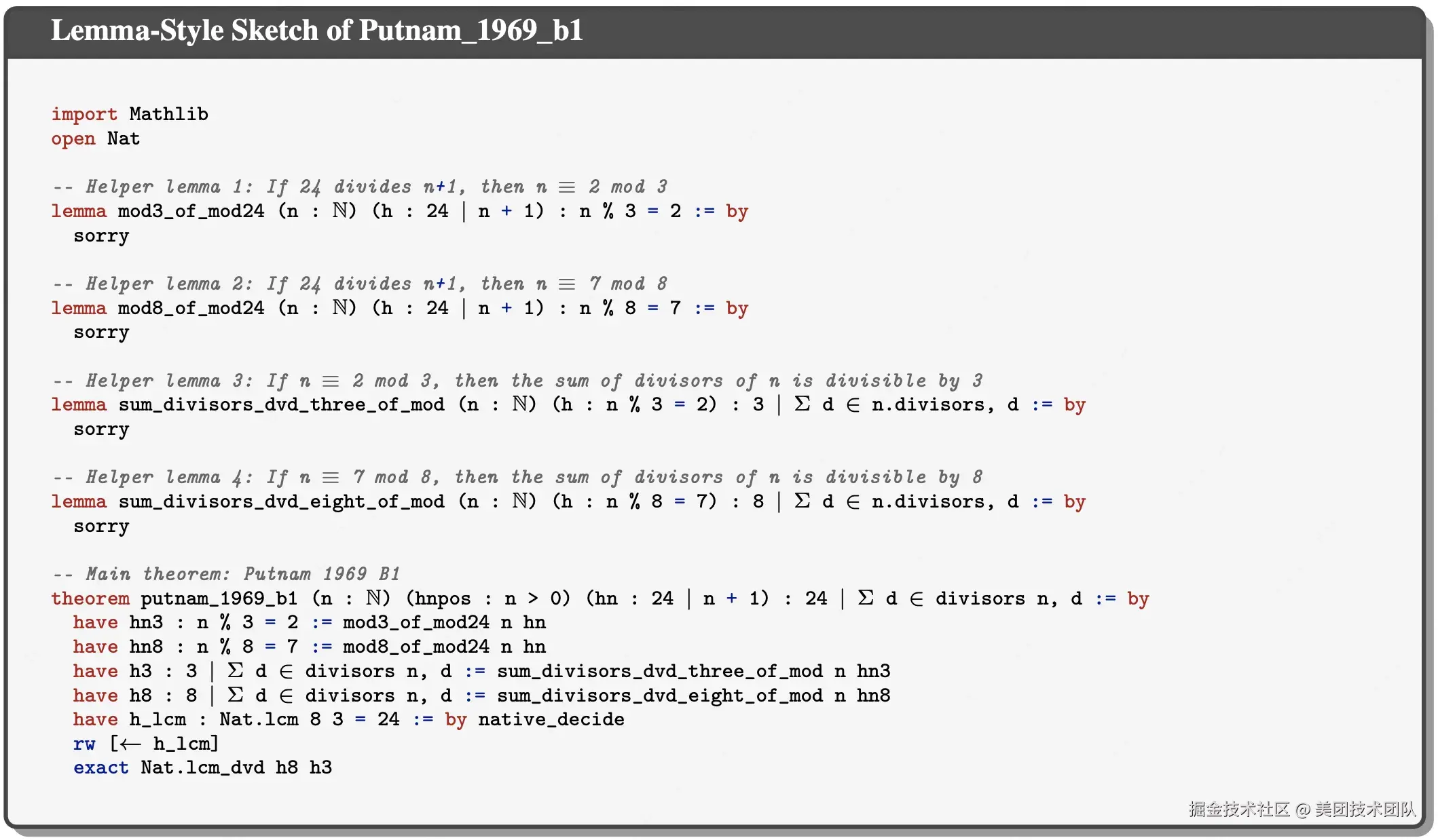 2. 草稿生成(Sketching)------"写解题大纲":面对复杂定理,不急于一步写完。模型会先写一个草稿,把大问题拆解成几个需要证明的小引理(Lemma),理清逻辑主线。