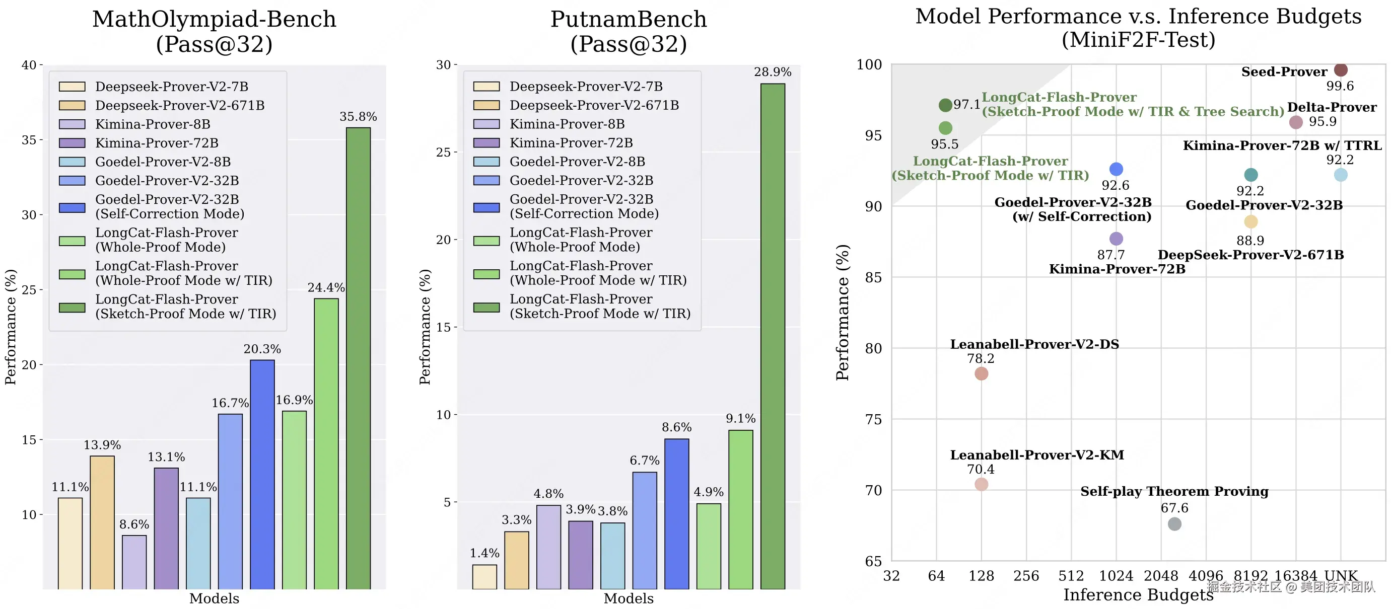 LongCat-Flash-Prover 在解决定理证明和形式化任务时,将形式化推理拆解为自动形式化(Auto-Formalization)、草稿生成(Sketching)和证明生成(Proving)三大原子能力。在结合工具集成推理(Tool-Integrated Reasoning,TIR)策略下,仅用 72 次推理预算,MiniF2F-Test 通过率就达到 97.1% ,在已知开源 Prover 模型中刷新 SOTA;在超难竞赛级任务上,MathOlympiad-Bench 达 46.7%(180 次预算),PutnamBench 达 41.5%(118 次预算),同样超越现有开源模型。