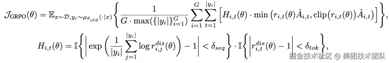 序列层面 Masking:我们首先通过计算所有 Token 的 IS Ratio 的几何平均值来估计序列级的训练-推理 Diff。对于整个序列,如果 Diff 超过一定范围,则认为其对训练稳定性有显著影响,并将移除该序列的梯度贡献。该策略旨在仅考虑序列级的训练-推理一致性度量,避免过度忽略有价值的标记。