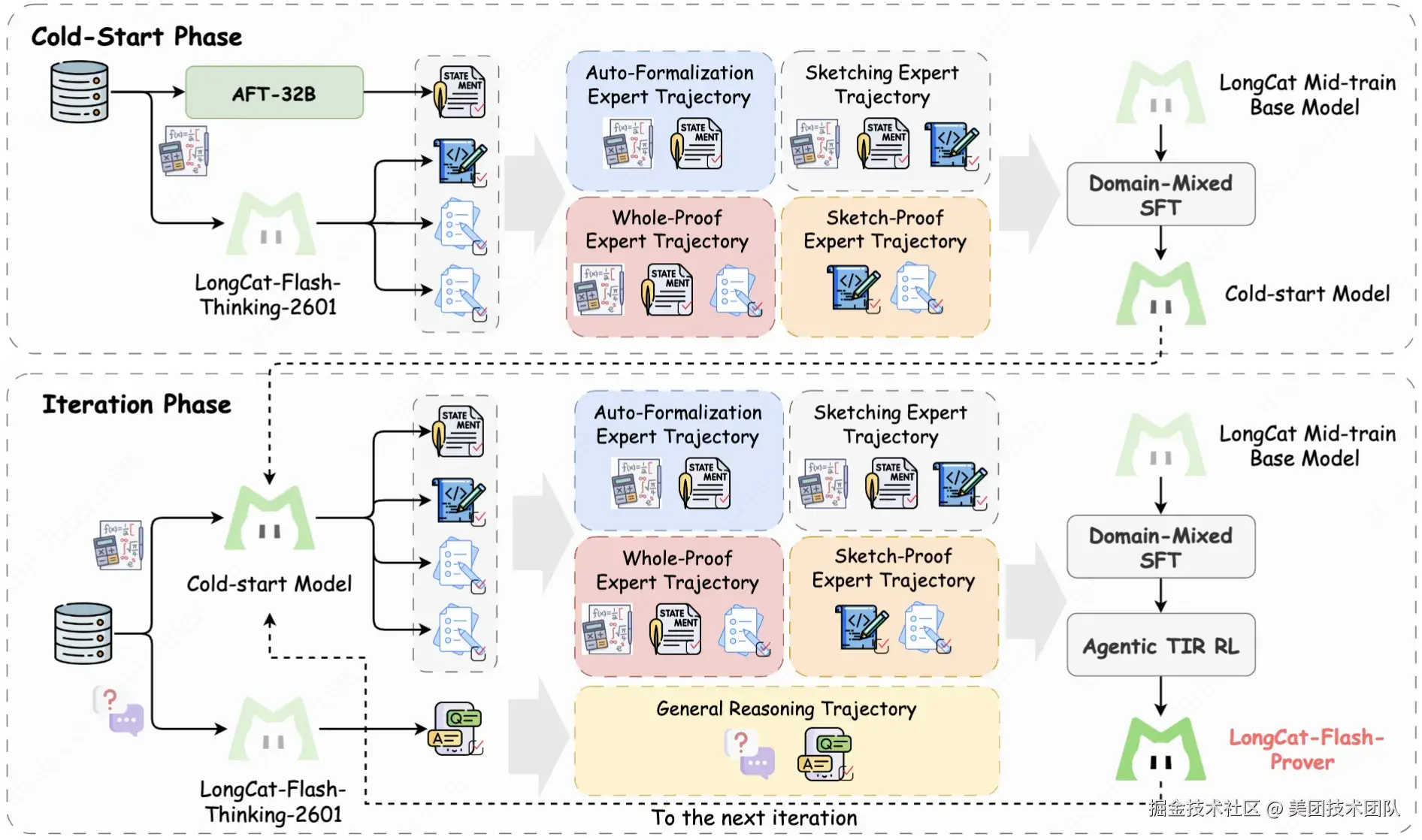 Cold-Start 阶段:我们首先利用团队在早期探索的基于 TIR 和 DPO 训练的 Auto-Formalizer 专有模型 ATF-32B 用于合成 Formal Statement。基于这些 Statement,我们利用 LongCat-Flash-Thinking-2601 生成高质量的带有多个 Lean4 相关验证工具反馈的轨迹。基于这些合成数据,我们通过执行去污、去重和基于难度和多样性的采样,构建了一个高质量的冷启动数据集。由于不同的专家模型来自不同的模型族,我们应用领域混合 SFT 来整合这些功能,并得到最终的冷启动模型。