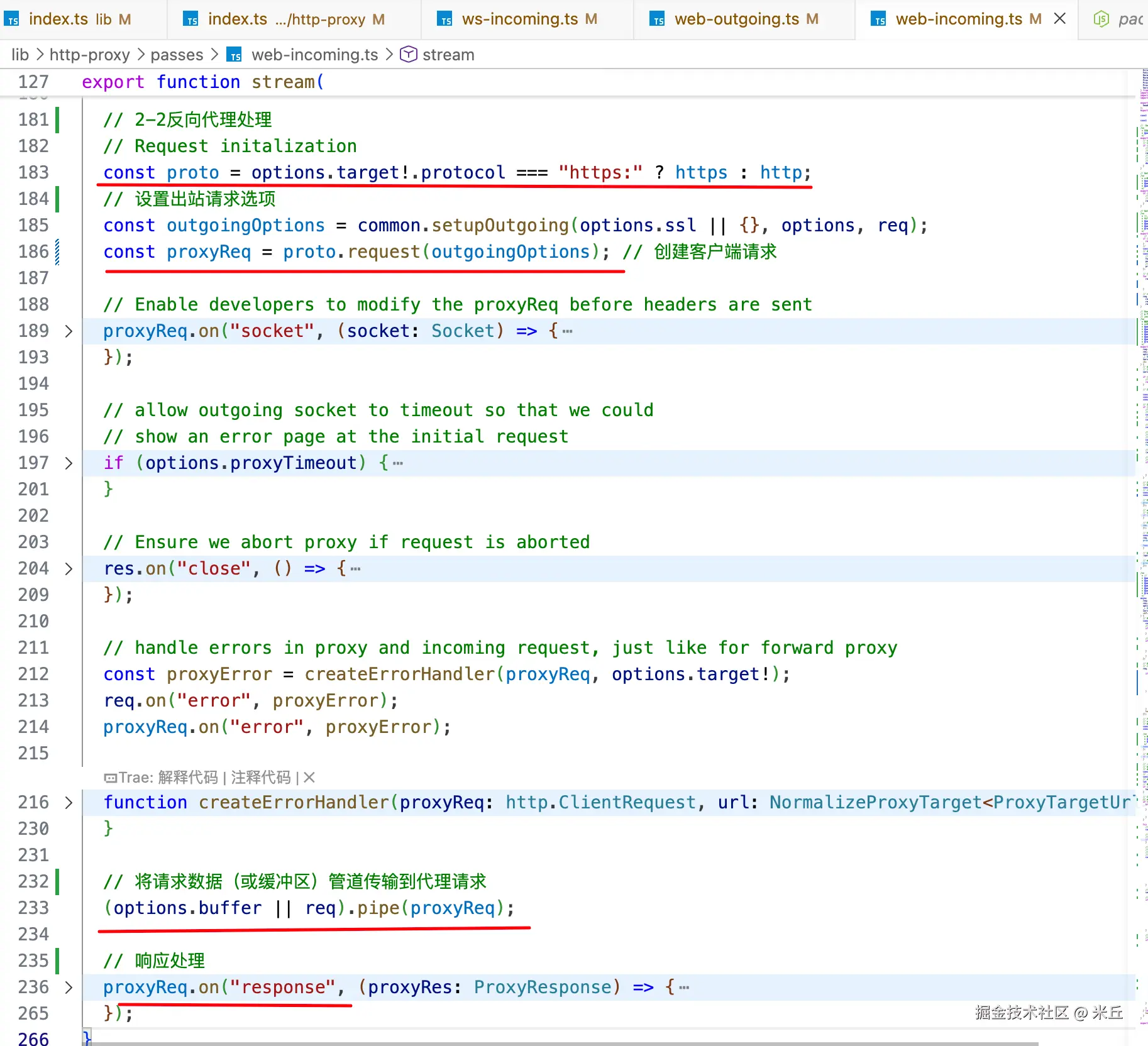 proxyMiddleware根据请求路径匹配代理规则。如果匹配,则进入代理流程;否则交给下一个中间件(如静态文件服务)。 - 转发请求 :