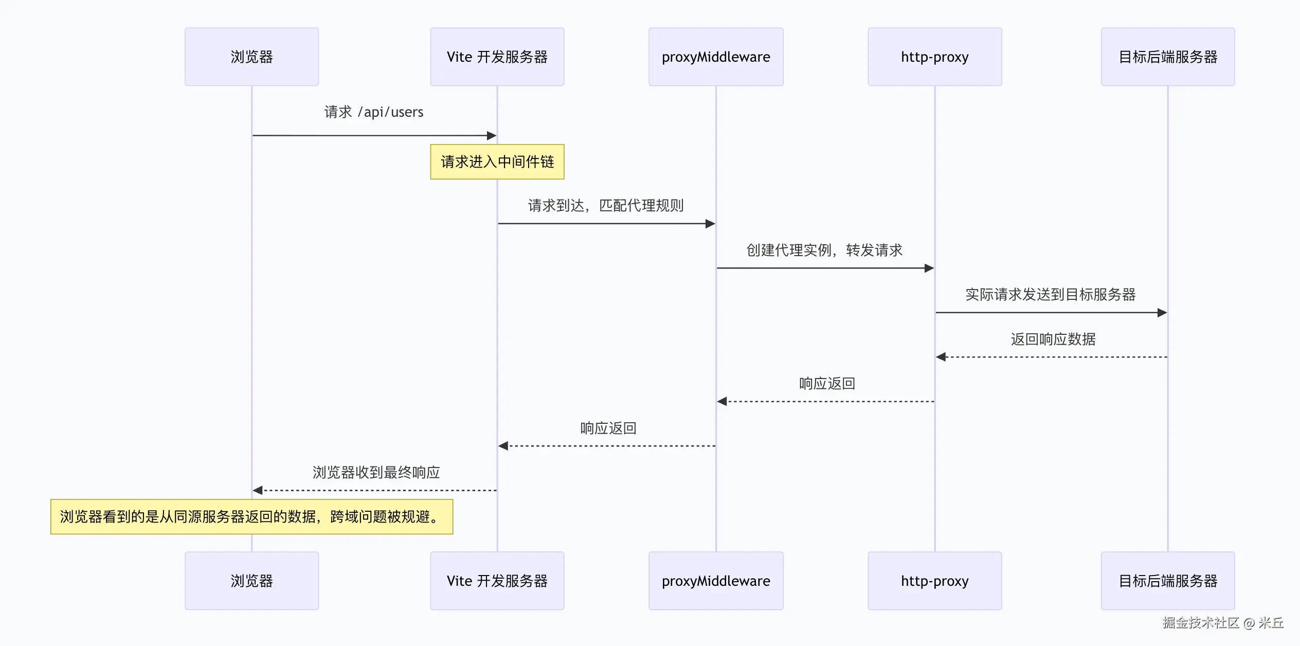 http-proxy将响应头和数据写回给浏览器。 - 完成:浏览器收到响应,由于是同源请求,没有跨域限制。