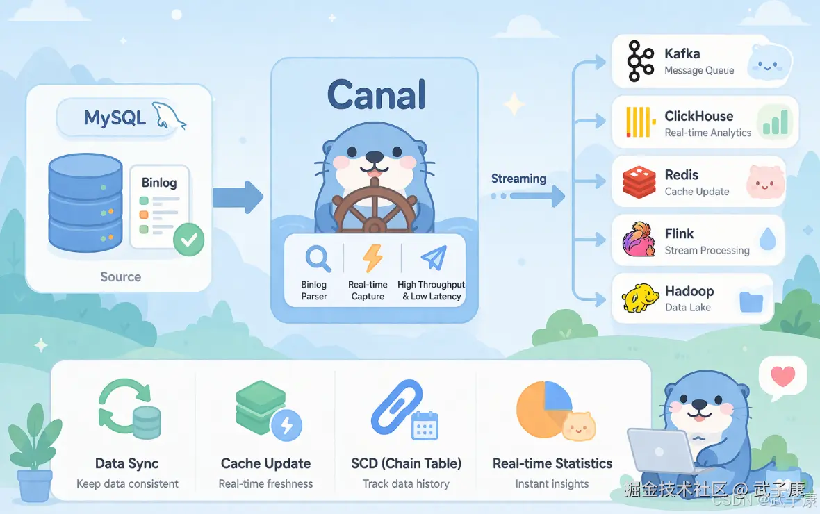 Canal 的诞生,正是为了解决这一问题。通过 变更数据捕获(CDC) 技术,Canal 能够高效地监控并捕获数据库中的数据变动(如插入、更新、删除等操作),然后将这些变动实时同步到下游系统,如搜索引擎、数据仓库、缓存等。