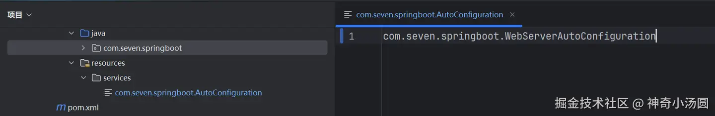 SPI的配置就完成了,相当于通过com.seven.springboot.AutoConfiguration文件配置了springboot中所提供的配置类。