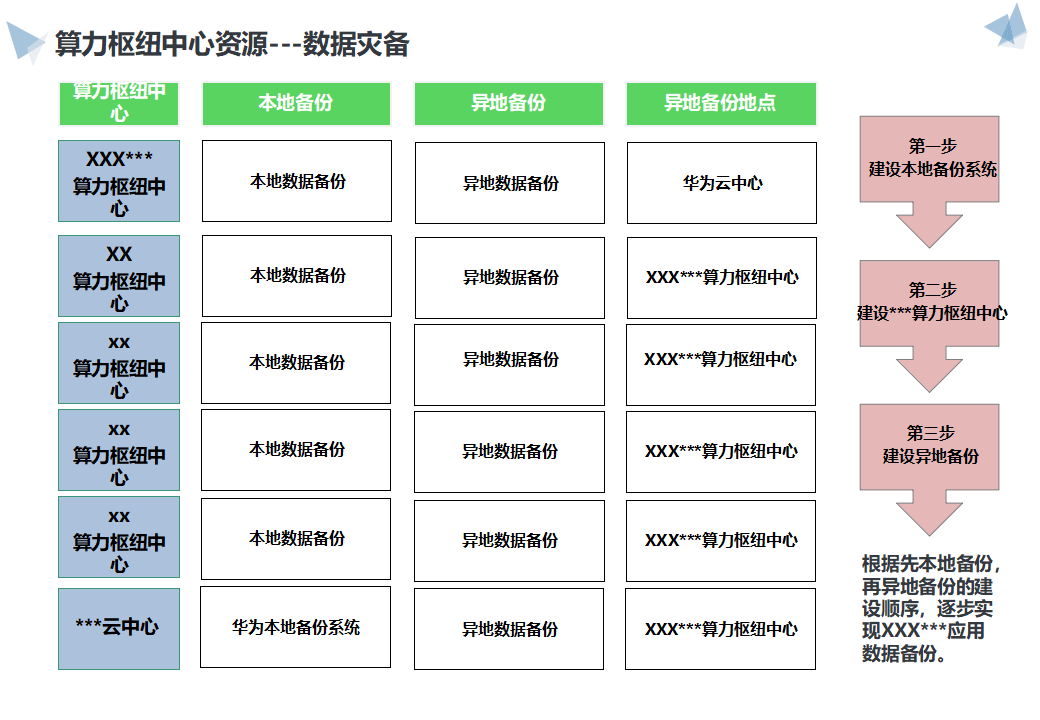 - 建设目标:所有算力枢纽中心必须先建设本地数据备份系统,确保物理故障下的数据可恢复性。