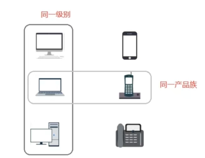 如下图,下面的六个产品都是一个工厂制造。第一列都是不同的电脑,称为同级别产品;第二行为一个电脑,一个手机,显然不是同级别产品,但它们是同一个工厂创造出来的,我们将它们称为一个产品族。