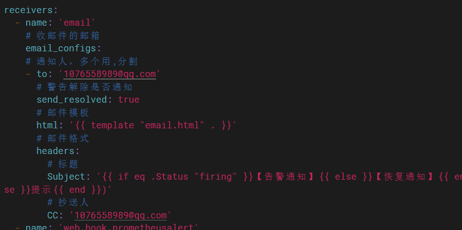 接着配置 Alertmanager,这里配置邮件通知的内容,配置文件如下: