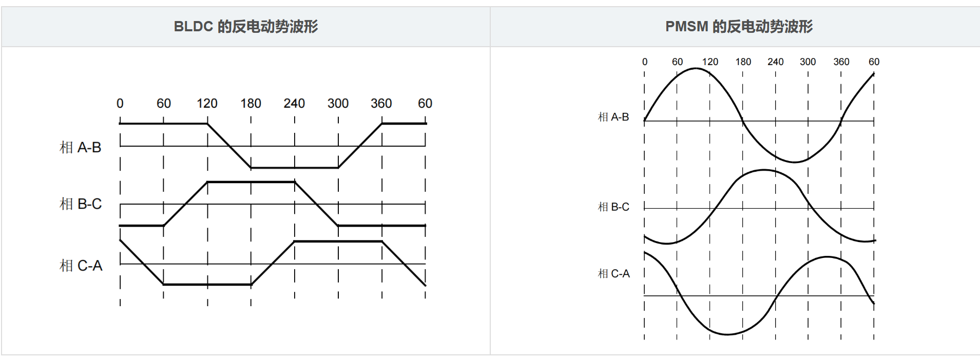 两者的主要区别是反电动势的波形. BLDC 反电动势接近于梯形波, 而 PMSM 反电动势接近于正弦波.