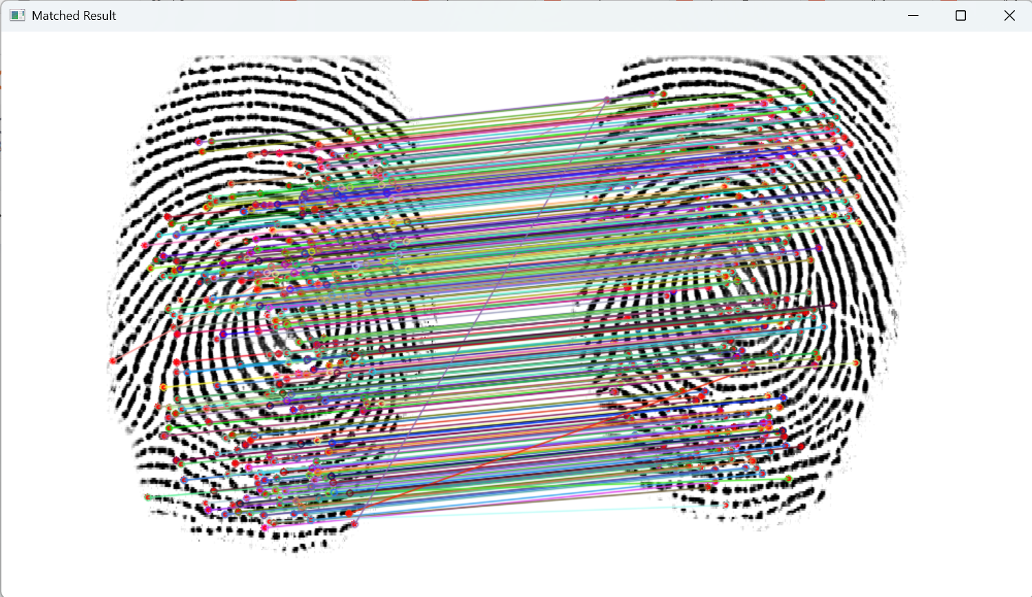 运行代码后,会依次弹出 3 个图像窗口,按任意键关闭当前窗口即可查看下一个,正常匹配的指纹结果具备以下特征: