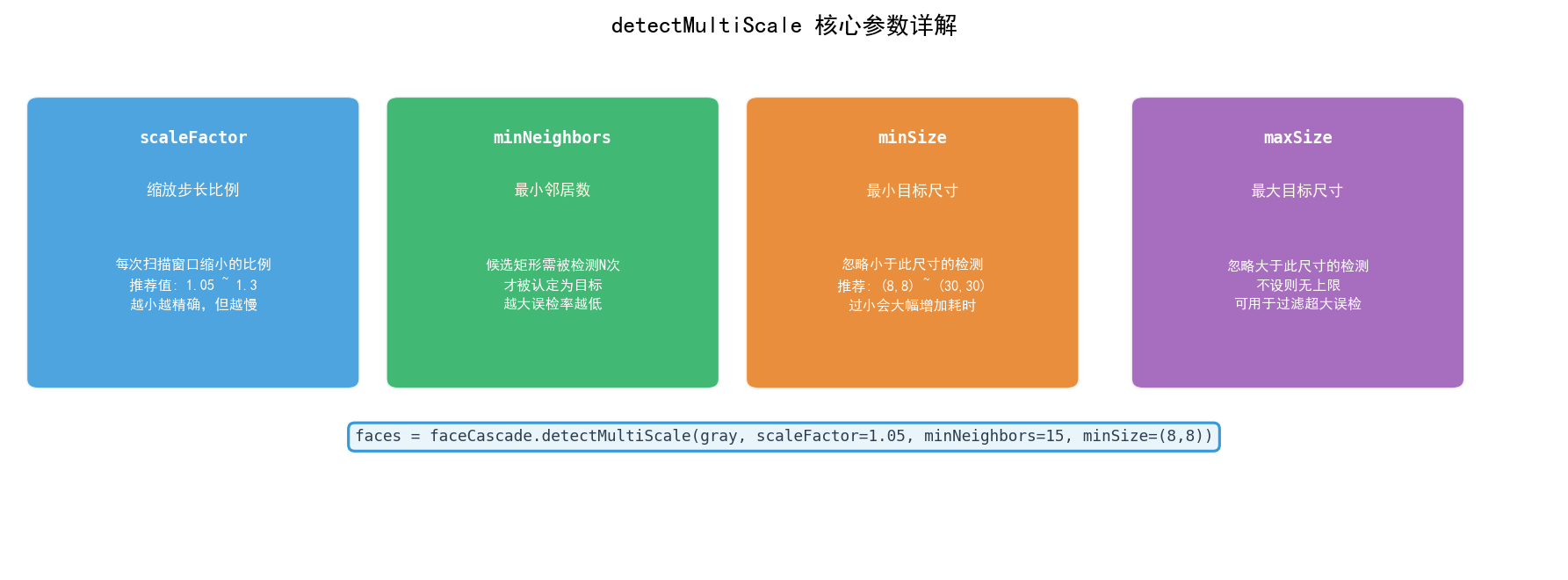 虽然通过图像金字塔支持多尺度,但极小目标(< 20×20 像素)的检测率很差,且对 scaleFactor 参数敏感------步长过大会漏检中间尺度的人脸。
