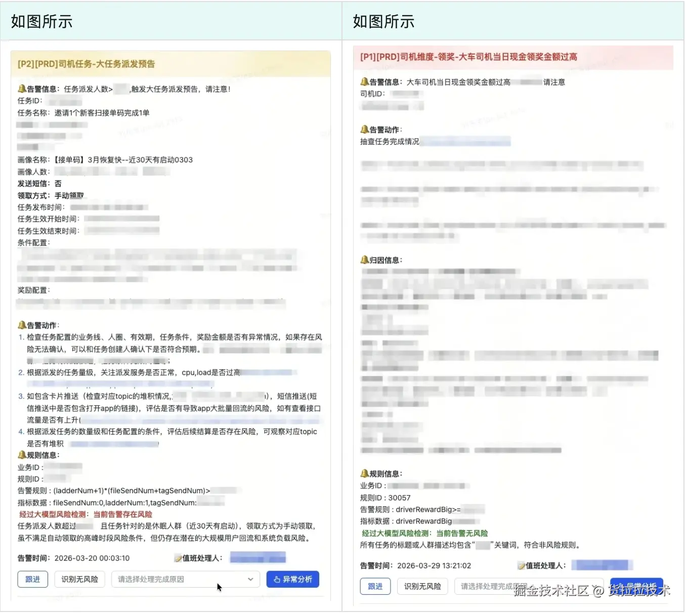 - 归因前置:告警推送前自动执行二次核对------对照业务表验证一致性、补全现场关联信息,低风险自动降级静默,让推到人手里的告警都"带着结论来"。