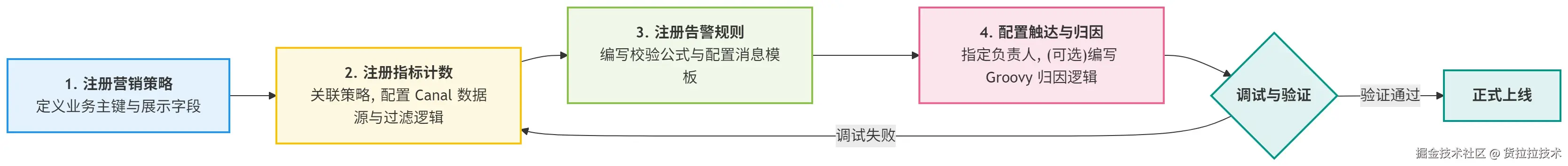 得益于全配置化的设计,研发人员在接入新的告警需求时,只需在平台界面完成简单的四步走配置。